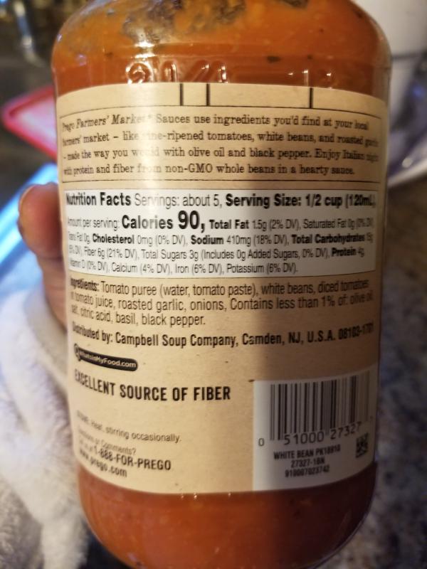 Prego ingredients label. Prego Italian Sauce, Flavored with Meat: Calories, Nutrition Analysis ... For women: 100 calories (25 grams, 6 tsp per day) For men: 150 calories (37 grams, 9 tsp per day) The FDA is more "generous", the Daily Value for added sugars is 200 calories (50 grams, 12 tsp per day). Here at Fooducate, we suggest sticking to the stricter option (only 25 grams per day for women, 37 grams for men). More info. Nutrition Facts for Prego Marinara Pasta Sauce • MyFoodDiary® 21% Sodium 480mg 3% Total Carbohydrate 10g 7% Dietary Fiber 2g Total Sugars 6g 0% Includes 0g Added Sugars Protein 2g 0% Vitamin D 0mcg 2% Calcium 30mg 4% Iron 0.8mg 8% Potassium 360mg 3% Vitamin A 25mcg 2% Vitamin C 2mg * Prego Homestyle Alfredo Sauce - Shop Sauces & Marinades at H-E-B ingredients water, cream, butter (cream, water, salt), parmesan cheese (part-skim milk, cultures, salt, enzymes), modified food starch, modified egg yolks, soybean oil, contains less than 2% of: salt, romano cheese (part-skim cow's milk, cultures, salt, enzymes), sugar, whey, enzyme modified cheese paste (granular and parmesan cheese [milk, … Prego® Pasta Sauces & Recipes | Prego® OUR SAUCE STORY. From tomato to sauce, our chefs work tirelessly to perfect our signature Prego pasta sauce. Famously thick and expertly balanced to ensure the perfect combination of flavor and consistency. Our farms are an average of 40 miles from our tomato processing plant, allowing us to harvest at the peak of freshness and cook within 6-8 ...