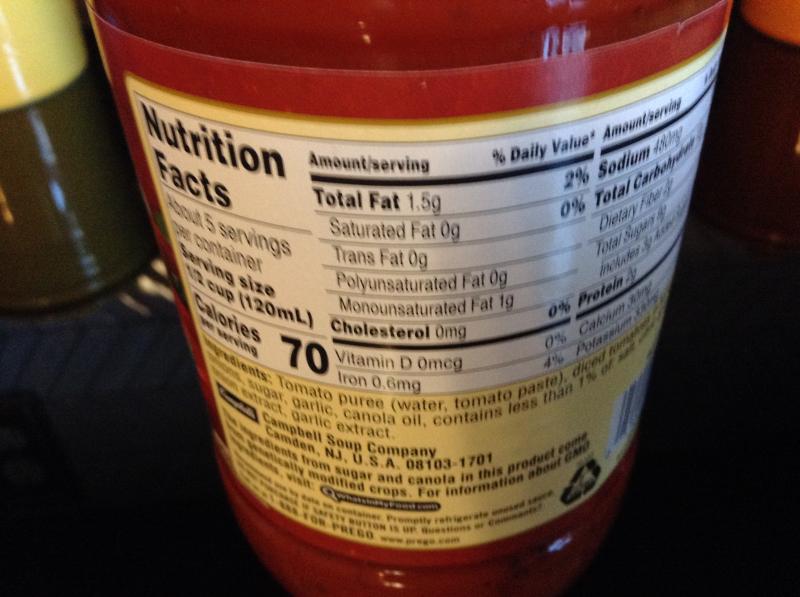 Prego Nutrition Facts. Calories, carbs, fat, sodium & more • MyFoodDiary® Get nutrition information for Prego items and over 200,000 other foods (including over 3,500 brands). Track calories, carbs, fat, sodium, sugar & 14 other nutrients. Toggle navigation Prego® Traditional Pasta Sauce with Classic Italian Flavor and Homemade ... Ingredients TOMATO PUREE (WATER, TOMATO PASTE), DICED TOMATOES IN TOMATO JUICE, SUGAR, VEGETABLE OIL (CORN, AND/OR CANOLA), CONTAINS LESS THAN 1% OF: SALT, DEHYDRATED ONIONS, SPICES, DEHYDRATED GARLIC, CITRIC ACID, ONION EXTRACT, GARLIC EXTRACT. Preparation Cook over medium heat, stirring occasionally until hot. Storage Serving Ideas Prego Spaghetti Sauce Nutrition Label - SauceProClub.com How to Make It. Stir the sauce and meatballs in 3-quart saucepan and heat to a boil over medium heat. Reduce the heat to low. Cover and cook for 20 minutes or until the meatballs are heated through, stirring occasionally. Serve the sauce and meatballs over the spaghetti. Sprinkle with the cheese, if desired. 4. Sugar in Prego Original Pasta Sauce - Nutrition Facts for Prego ... Total carbs in a Prego Original Pasta Sauce is 13 (g), 4% of daily value. Sugar in a Prego Original Pasta Sauce is about 10 g and the amount of protein in a Prego Original Pasta Sauce is approximately 2 g. Please refer to the nutrition facts label seen to the left for a full breakdown of complete nutrition found in a Prego Original Pasta Sauce .