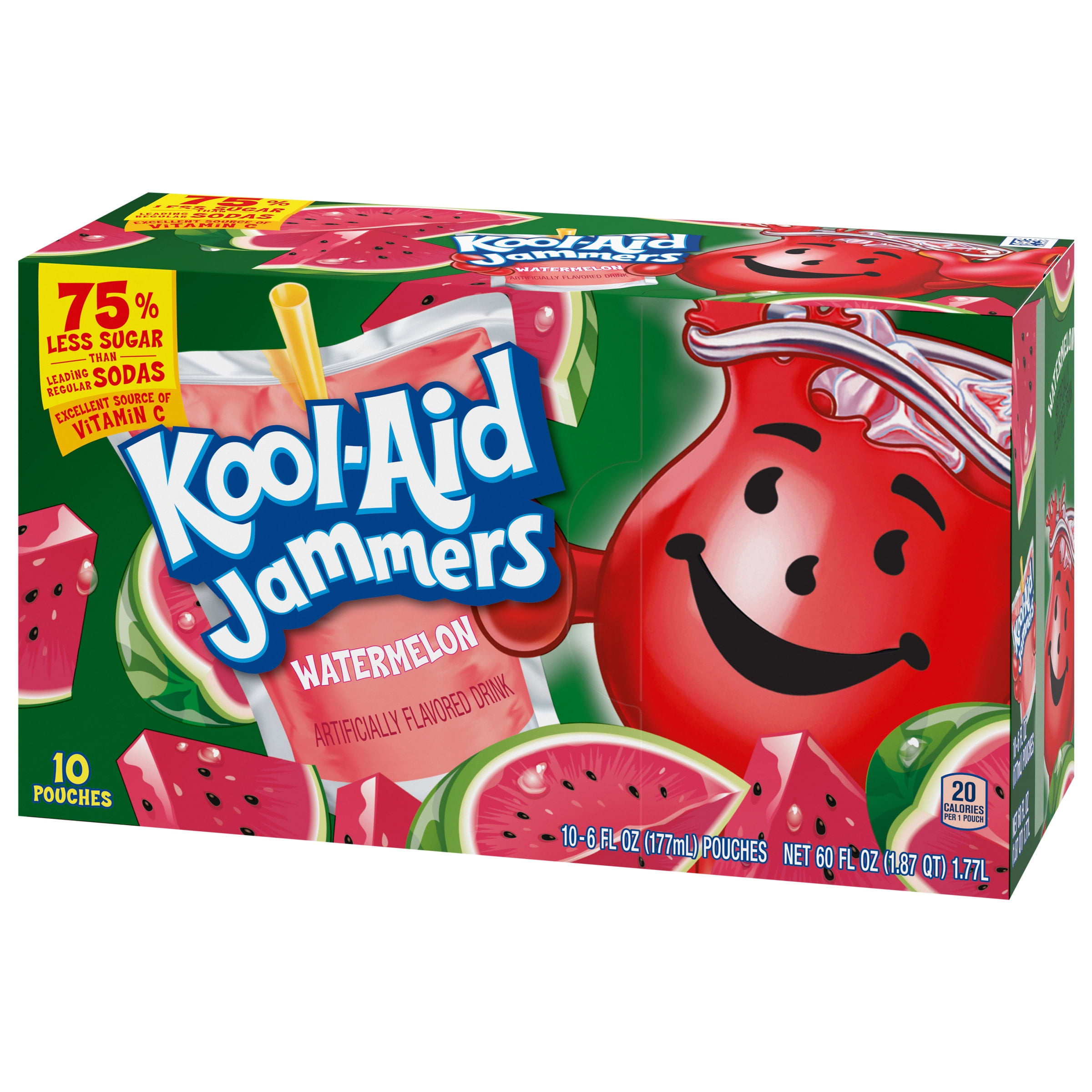 › product › 00043000053775Kool-Aid Jammers Watermelon Drink, 10 ct Box, 6 fl oz Pouches Kool-Aid Jammers Watermelon Drink, 10 ct Box, 6 fl oz Pouches BUY NOW Excellent Source Of Vitamin C | Less Sugar - 75% Less Sugar than Leading Regular Sodas - Per 12 Fl Oz This Product 10g Total Sugar, Leading Regular Sodas 40g Total Sugar So Many Ways to Enjoy Kool-Aid. Flavorful fun made easy - available in a rainbow of flavors! Read More