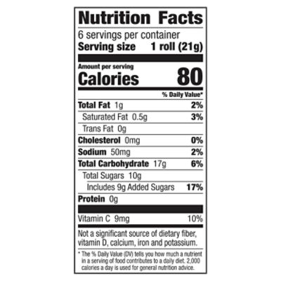 Fruit Roll up calories, carbs & nutrition facts - MyFitnessPal Nutritional Info Carbs 17 g Dietary Fiber 0 g Sugar 9 g Fat 1 g Saturated 0 g Polyunsaturated 0 g Monounsaturated 0 g Trans 0 g Protein 0 g Sodium 45 mg Potassium 0 mg Cholesterol 0 mg Vitamin A 0 % Vitamin C 10 % Calcium 0 % Iron 0 % Percentages are based on a diet of 2000 calories a day. Activity Needed to Burn: 80 calories 12 Minutes of Cycling