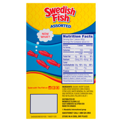 SWEDISH FISH Soft & Chewy Candy, 8 oz - Walmart.com Nutrition facts. Refer to the product label for full dietary information, which may be available as an alternative product image. 8 Servings Per Container. Serving Size 5 pieces (30g) ... SWEDISH FISH Soft & Chewy Candy delivers the classic flavor and easily recognizable shape in delicious soft, chewy candy pieces. ... Swedish Fish® Assorted Soft & Chewy Candy 5 Lb. Bag Swedish Fish® Assorted Soft & Chewy Candy 5 Lb. Bag. Net wt. 80 oz . 00070462433333. Nutrition. Ingredients. Allergens. Features & Benefits. Company, Brand & Sustainability. Please refer to the label on your product for the most accurate nutrition, ingredient, and allergen information.