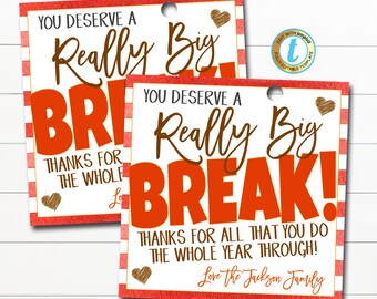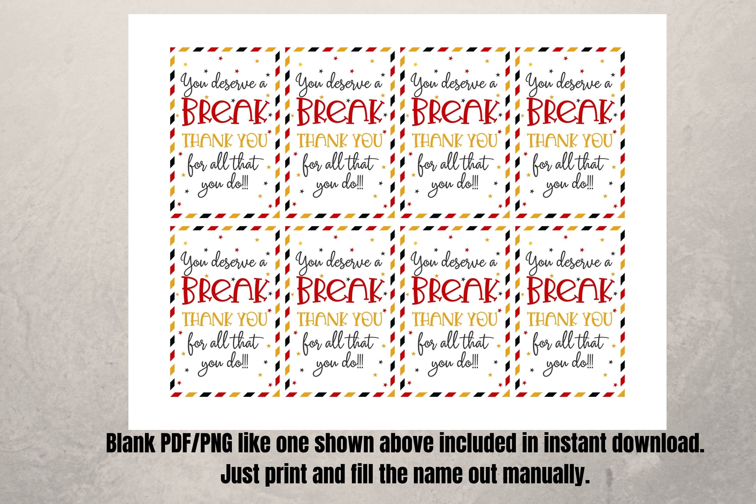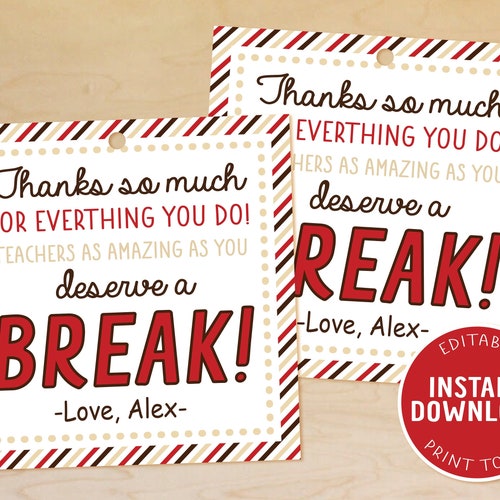 You Deserve A Break - Eighteen25 | Teacher appreciation printables ... Simply edit, print, hole punch and tie around a muffin! TEMPLATE FORMATTED SIZES: 3.5 x 3.5" (Tag) *print multiple tags (6 per sheet) by going to download - pdf - click on 'save paper' ________________________________________________ IMPORTANT: This is a DIY…. A.