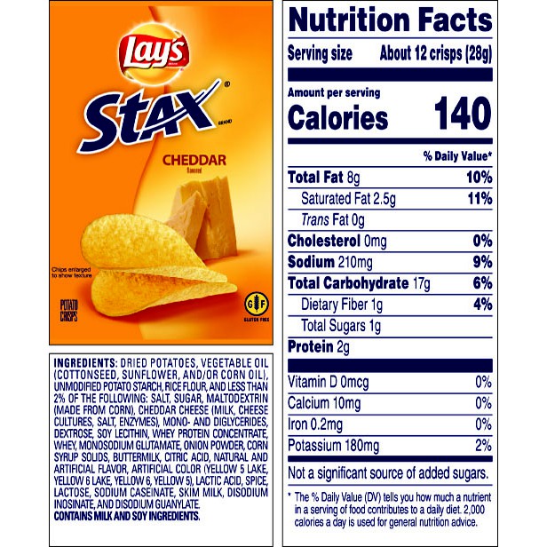 Well - The New York Times F.D.A. Report Faults Agency’s Food Unit for Leaderless Dysfunction. Spurred by the infant formula crisis, a panel found that the agency shied away from tough decisions, sometimes fearing ... LAY'S® Salt & Vinegar Flavored Potato Chips Nutrition Facts. Information about serving; Serving size About 17 chips (28g) Amount per serving Calories 160; Nutrition Fact and Amount Daily Value Percentage % Daily Value* Calories 160 Fat 10g 15% Saturated 1.5g 7% ...