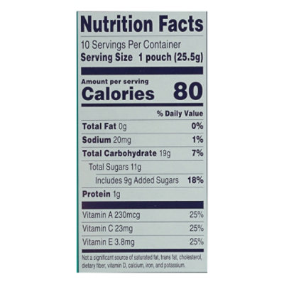 Welch's Fruit Snack Nutrition Facts & Calories Nutrition Facts Welch's Fruit Snack Serving Size: Pouch (26g) * Amount Per Serving Calories 81.6 cal Calories from Fat 0 cal % Daily Value Total Fat 0 g 0% Saturated Fat 0 g Cholesterol 0 mg Sodium 0.8 mg Total Carbohydrate 20.4 g 6.8% Dietary Fiber 0 g 0% Sugars (Added) 11.2 g Protein 0 g 0% Vitamins Vitamin A 0 IU Vitamin B6