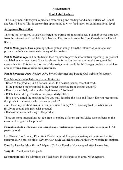 Food label analysis assignment. Nutritional Analysis & Food Label Nutrition Facts | FDA ... Now that you have a food nutrition analysis completed you may be wondering how you are going to make an FDA-compliant nutrition facts panel that will fit onto your food label design. Among the top companies that provide nutrition facts, our customized solution includes nutrition facts as an Adobe Illustrator® (.ai) file. How to Understand and Use the Nutrition Facts Label | FDA The information in the main or top section (see #1-4) of the sample nutrition label (below) can vary with each food and beverage product; it contains product-specific information (serving size, calories, and nutrient information). The bottom section contains a footnote that explains the % Daily Value and gives the number of calories used for genera... Food Label Analysis.docx - Food Label Analysis Assignment ... Food Label Analysis Assignment 20 points Instructions: In this assignment, you will be analyzing a food for its nutrition content and relating it to energy production in our cells. Please choose a food with a label (not a drink). Using the both the nutrition label and the ingredient label, answer the following questions.