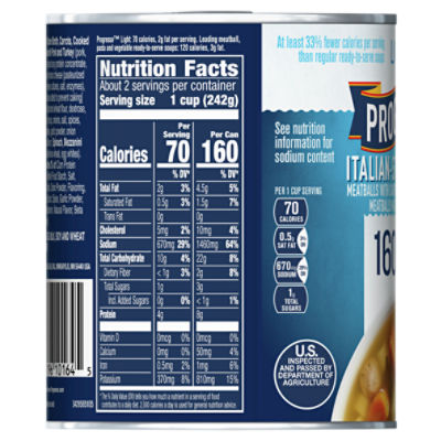 Progresso soup nutrition label. Vegetable Classics Garden Vegetable | Canned Soup Nutrition Facts ; Trans Fat, 0g, 0g ; Cholesterol, 0mg0%, 0mg0% ; Sodium, 650mg28%, 1450mg63% ; Total Carbohydrate, 18g7%, 41g15%. Reduced Sodium Roasted Chicken Noodle | Canned Soup Nutrition Facts ; Trans Fat, 0g, 0g ; Cholesterol, 20mg7%, 45mg14% ; Sodium, 470mg20%, 1020mg44% ; Total Carbohydrate, 12g4%, 26g9%. Vegetable Classics Vegetable | Canned Soup | Progresso Nutrition Facts ; Trans Fat, 0g, 0g ; Cholesterol, 0mg0%, 0mg0% ; Sodium, 600mg26%, 1350mg59% ; Total Carbohydrate, 16g6%, 35g13%. Traditional Chicken Noodle | Canned Soup | Progresso Nutrition Facts ; Trans Fat, 0g, 0g ; Cholesterol, 25mg8%, 50mg17% ; Sodium, 680mg30%, 1510mg66% ; Total Carbohydrate, 13g5%, 29g11%.