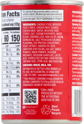Campbell's Condensed Cream of Chicken Soup 50 oz. Can - WebstaurantStore Cream of Chicken Soup Details The epitome of comfort food, Campbell's 50 oz. can of cream of chicken condensed soup boasts a rich broth base made with real cream and rich chicken stock. It's speckled with soft pieces of savory chicken for hearty taste and features a smooth consistency.